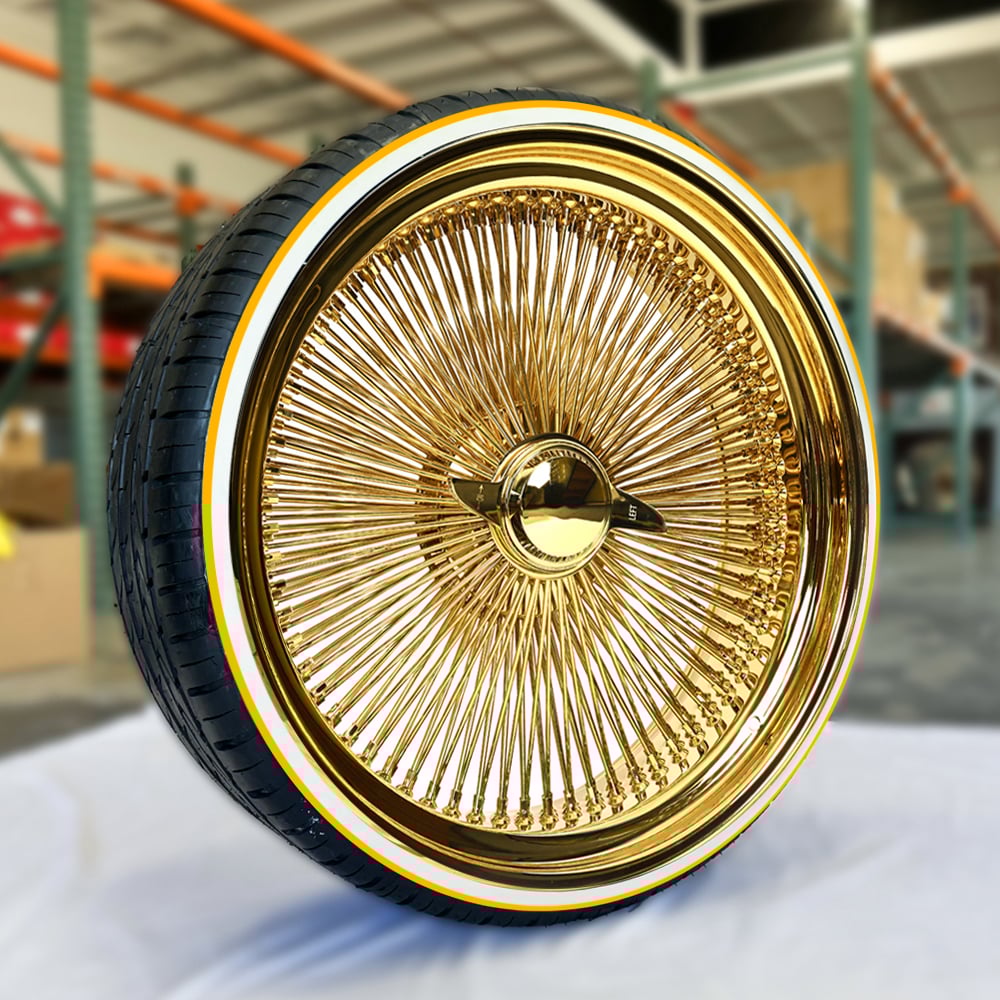 If you’re building a Donk, custom lowrider, or show car and want a high-impact, luxurious setup, this 24×10” All Gold 204-Spoke + 255/30R24 Whitewall & Gold Stripe tire package is your golden ticket. It’s a premium upgrade, not just for looks—but for legacy.