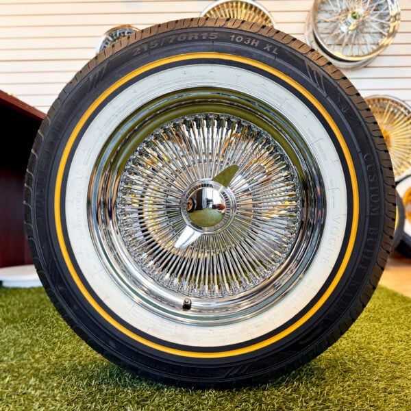 Includes: 4x 15×7″ Chrome 100 Spoke Wire Wheels + 4x 215/70R15 Vogue Tires (Whitewall & Gold Stripe, Mounted & Balanced)