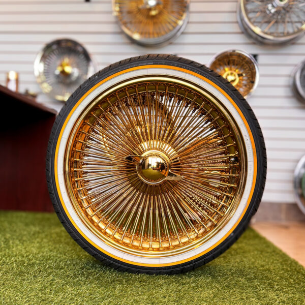 Always in stock & Ready-Ship, Step into timeless elegance with these Genuine20×8″ FWD All Gold 150-Spoke Wire Wheels, designed for front-wheel-drive vehicles that demand both modern luxury and vintage appeal. Each wheel features a stunning triple-plated gold finish—from center to lip—for a radiant, show-stopping presence.