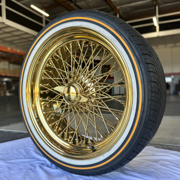 Add true lowrider elegance with this set of Genuine20×8” Standard 80-Spoke Cross Laced Gold Wire Wheels paired with 245/40R20 Original Vogue Tires. Always in stock & Ready-Ship. The cross-laced spoke pattern adds depth and a more intricate design, while the triple-plated gold finish delivers an unmistakable show-quality shine.