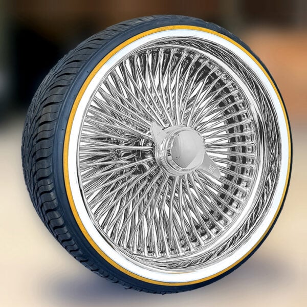 Make a bold statement with this complete set of 22×8″ 150-Spoke Standard Chrome Wire Wheels mounted on 265/35R22 Vogue Gold Stripe Tires. These wheels offer a deep-laced, high-polish look perfect for lowriders, luxury sedans, and custom classics.