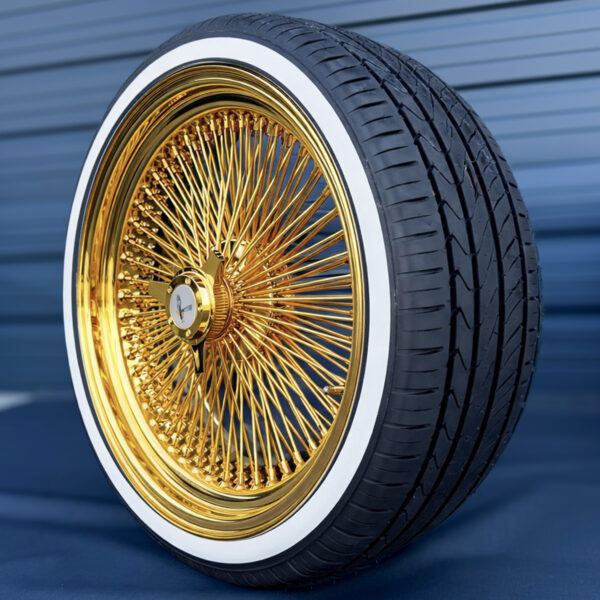 22×8” Pure 24K California Gold Wire Wheels – 150 Spoke + True Whitewall Tires
