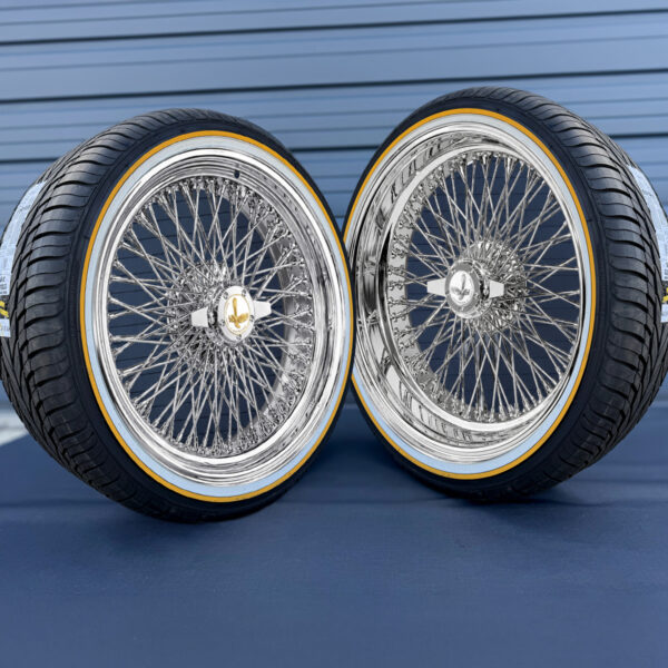 22×8” Staggered Chrome Wire Wheels – 96 Spoke Quad Cross Lace + 265/35R22 Original Vogue Gold Stripe Tires | Set of 4