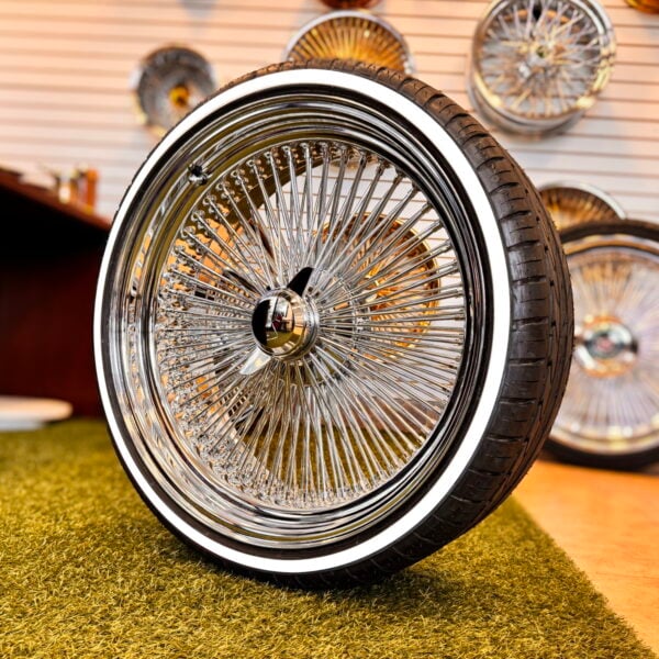 Upgrade your ride with this complete set of 22×8″ 150-Spoke Standard Chrome Wire Wheels paired with 255/30R22 Custom Whitewall Tires. Designed for luxury and style, this combo delivers a clean deep-dish look and authentic custom whitewall that’s handmade in the USA—not painted or glued.