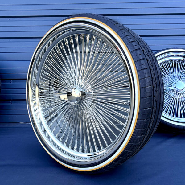 24×10” Chrome Wire Wheels – 204 Spoke Standard + 255/30R24 Custom True Whitewall & Yellow Stripe Tires