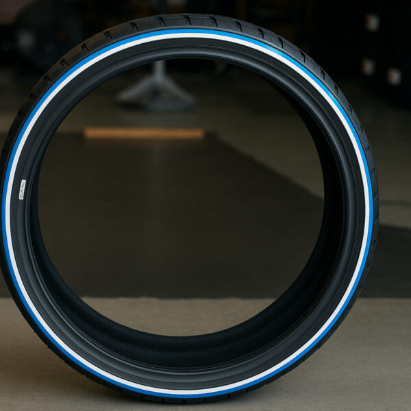 275/25ZR28 Whitewall & Blue Stripe Tire – Custom Handmade USA | Ultra Wide Low Profile for Luxury Builds