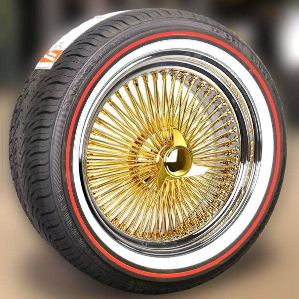 17×8″ Gold Wire Wheels – Standard 100 Spoke with Chrome Lip + Vogue Tires 235/55R17 Red Stripe – Set of 4